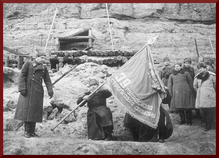 Командующий 62-й А Чуйков вручает гвардейской знамя 39-й гв. сд
