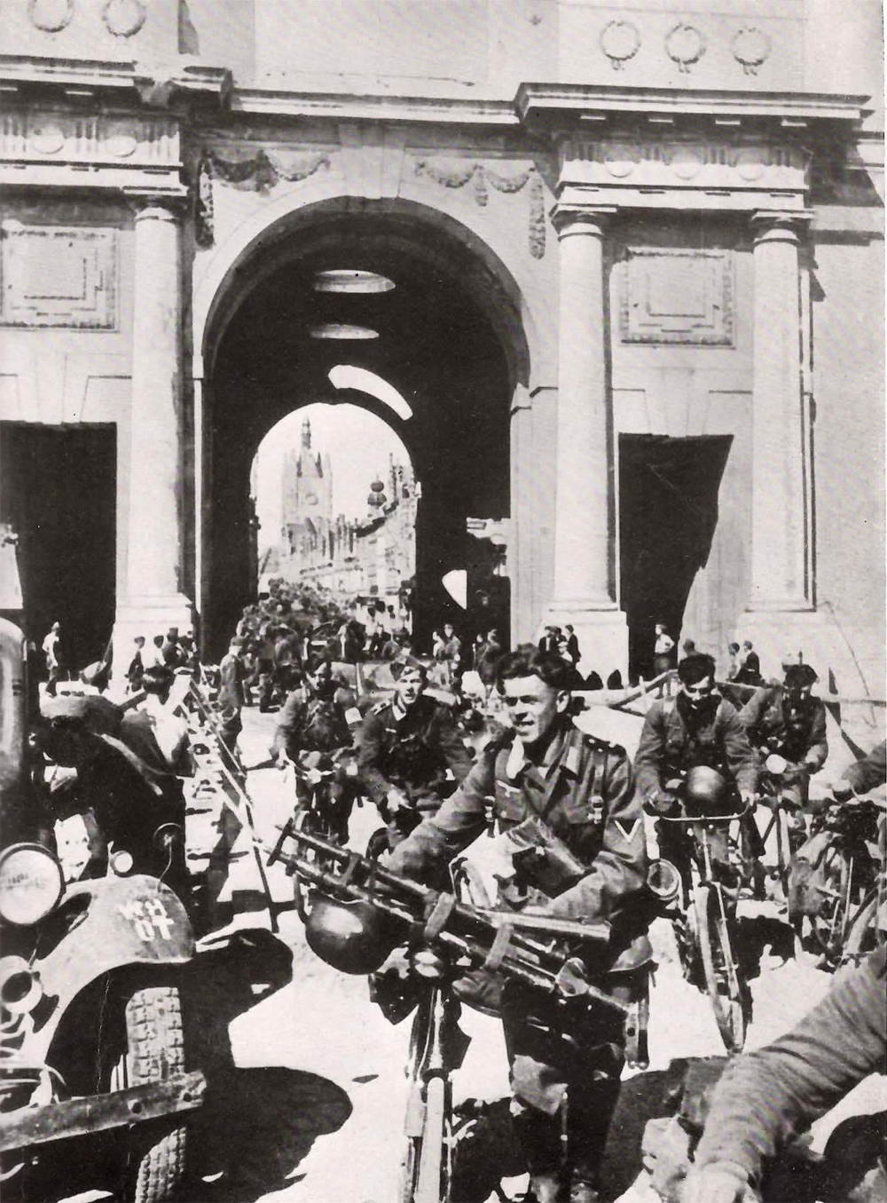 Ypern erreicht! Durch die berühmte Pforte von Menin zieht der Sieger in die "Stadt des Schweigens". Im Hintergrund die Tuchhalle.