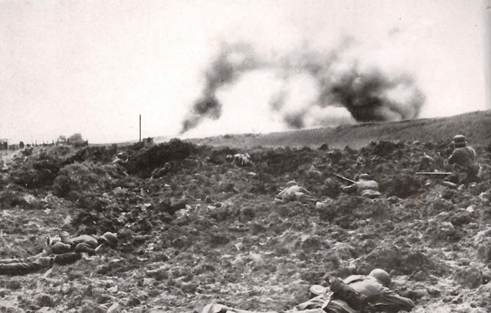 Unsere Infanterie hat sich bis dicht an das belgische Fort Boncelles herangearbeitet, gleich wird der Sturmangriff losbrechen.
