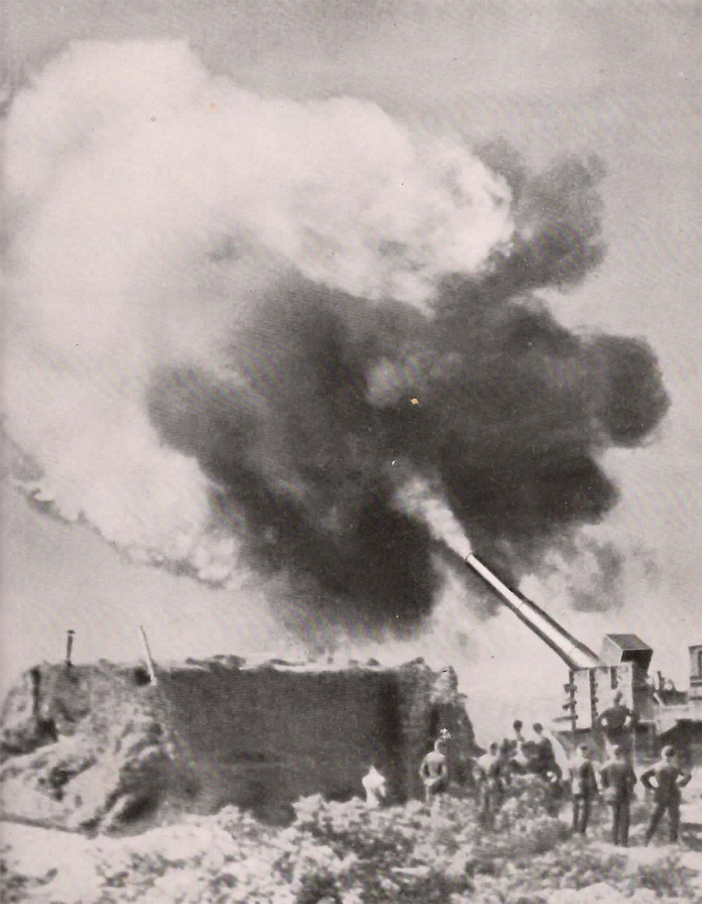 Der siegreichen Infanterie ist die schwere Marineartillerie nachgerückt und eröffnet das Feuer auf ferne Ziele.