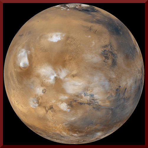Water ice clouds hanging above Tharsis PIA02653 black background