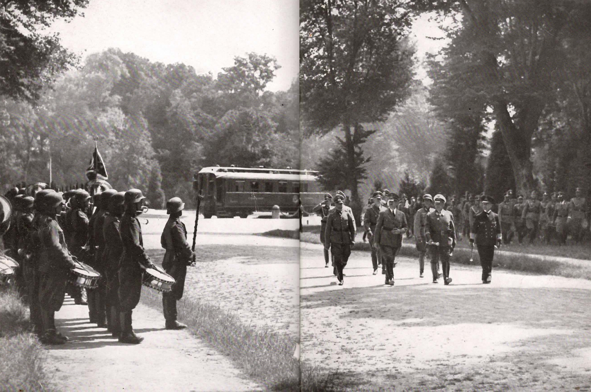 Compiégne 1940: An gleicher Stelle empfing Adolf Hitler, Führer des deutschen Volkes, Rächer der zwei Millionen Weltkreigstoten, die um Waffenstillstand bittenden Franzosen und tilgte die Schmach von 1918. Es geschah an einem hellen Frühlingstag, zur Stunde der Sonnenwende.