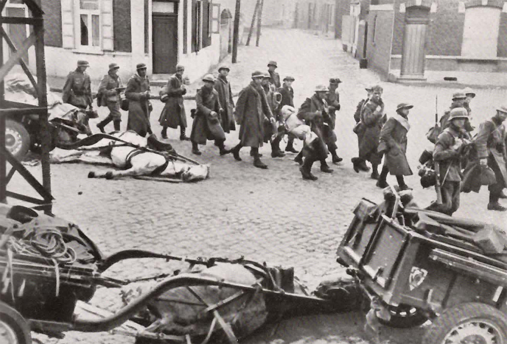 Hier sind motorisierte deutsche Einheiten vorbeigekommen und haben den feindlichen Widerstand gebrochen. Vorbei an den Trümmern zerschlagenenr leichter Munitionskolonnen zieht die endlose Schlange der Kriegsgefangenen.