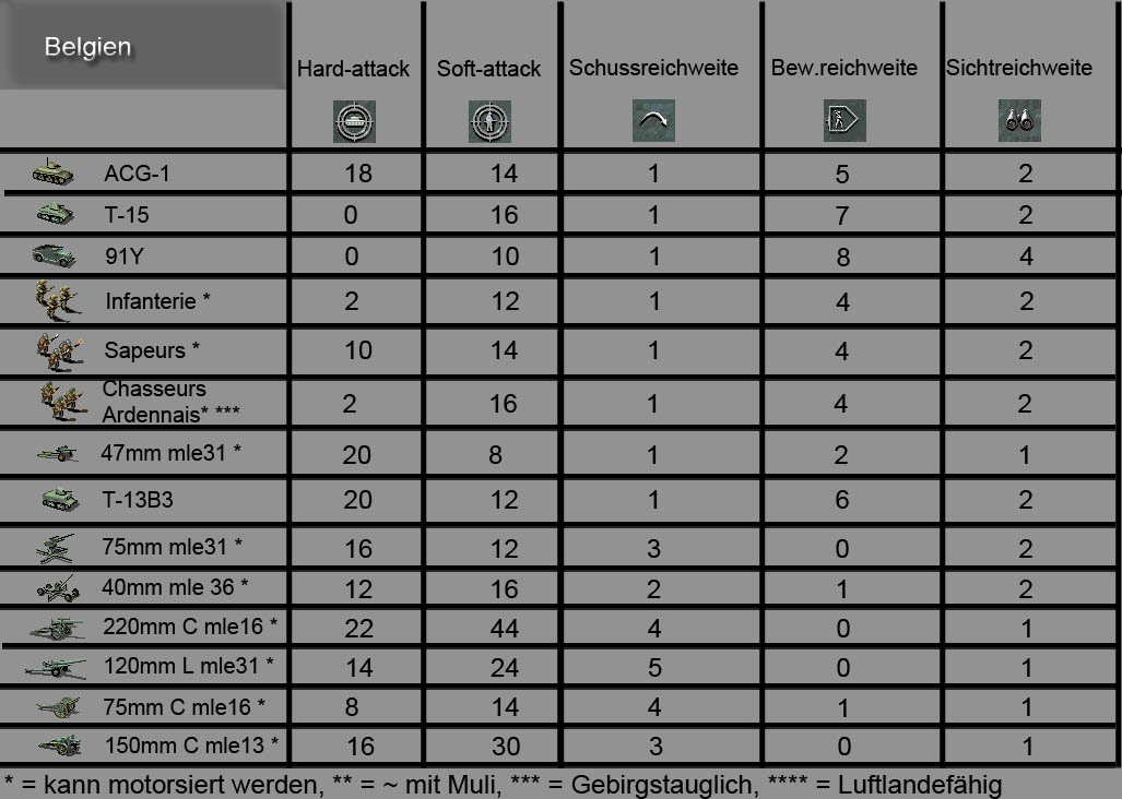 selbst erstellte Einheitenliste für die Belgier - Taktikschule