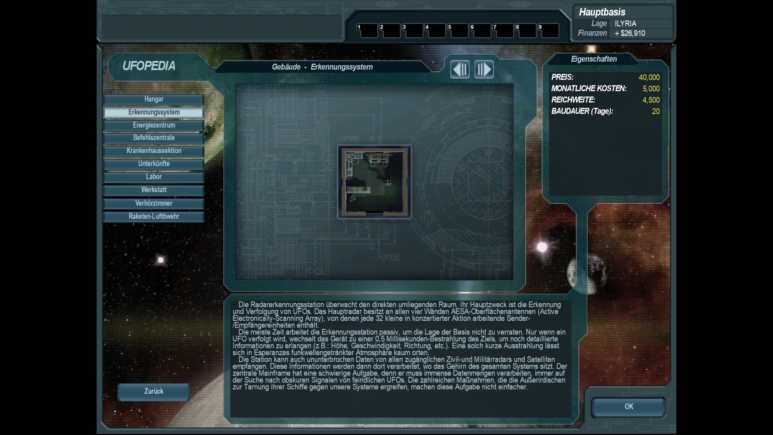 ein ganz normales Erkennungssystem, welches mit unserer bestehenden Technologie gebaut werden kann; wird in ähnlicher Form auch vom Militär und Zivil genutzt; diese Erkennungssysteme sind einses der wenigen Gebäude, welche in den Sekundärbasen (kleinere Außenposten) gebaut werden können; erstes Erkennungssystem ist bei Übernahme der Hauptbasis schon in Betrieb