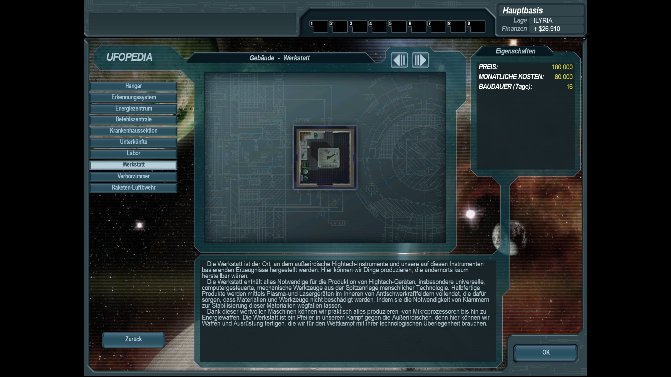 eine ganz normale Werkstatt mit der bestmöglichen zur Verfügung stehenden menschlichen Technologie; ist nur in der Hauptbasis aufbaubar und die erste Werkstatt ist nach der Übernahme direkt verfügbar; in UFO 2 ET können entsprechende Werkstätten (egal ob Standard oder entsprechend verbesserte Varianten) auch in den Sekundärbasen (kleine Außenposten) gebaut werden, um die Modernisierung der Abfangjäger- und Überlegenheitsjäger sowie Kampfhubschrauber direkt vornehmen zu können, d. h. bessere Bewaffnung und Schutzeigenschaften bauen sowie entsprechend neue kampffähige Luftvahrzeuge zu bauen; zudem kann man auch für den freien Markt produzieren, sofern keine Aufwertungsausrüstung oder Ersatzbau für die kampffähigen Luftflotten ansteht; leider fehlt dies in der UFO 1 ET: Platinum-Version komplett, sodass die Hauptbasis alles produzieren muss, wie schon bei den Vorgängern UFO 1 ET: Standard-Version / Gold-Version!