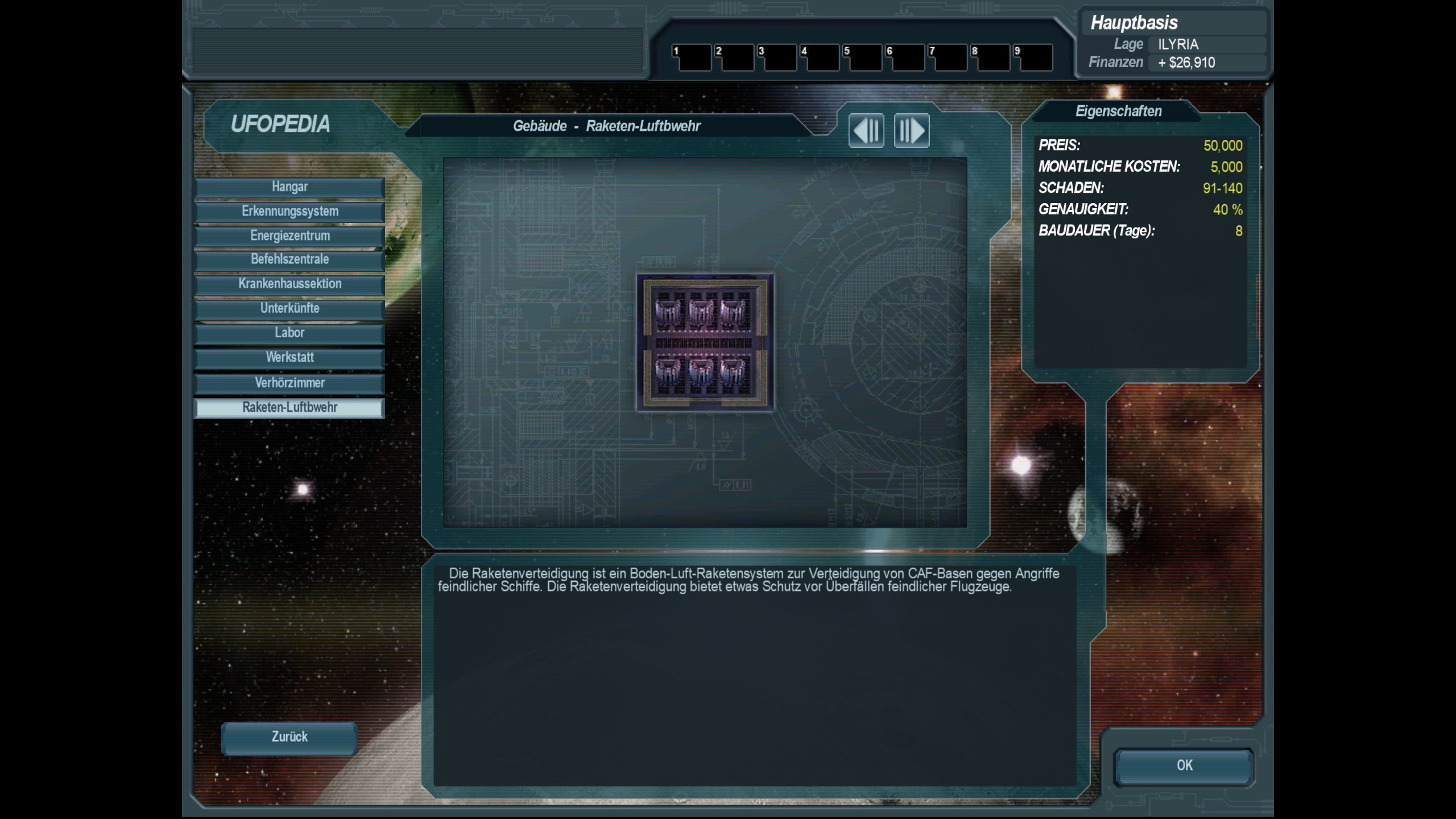 eine ganz gewöhnliche Raketen-Luft-Abwehr zur Sicherung unserer Haupbasis sowie den Sekundärbasen; ist eines der wenigen Gebäude die auf Sekundärbaen (kleinere Außenposten) gebaut werden kann; wird ebenfalls von den Militärs und der Polizei verwendet, um ihre größeren Stützpunkte zu verteidigen