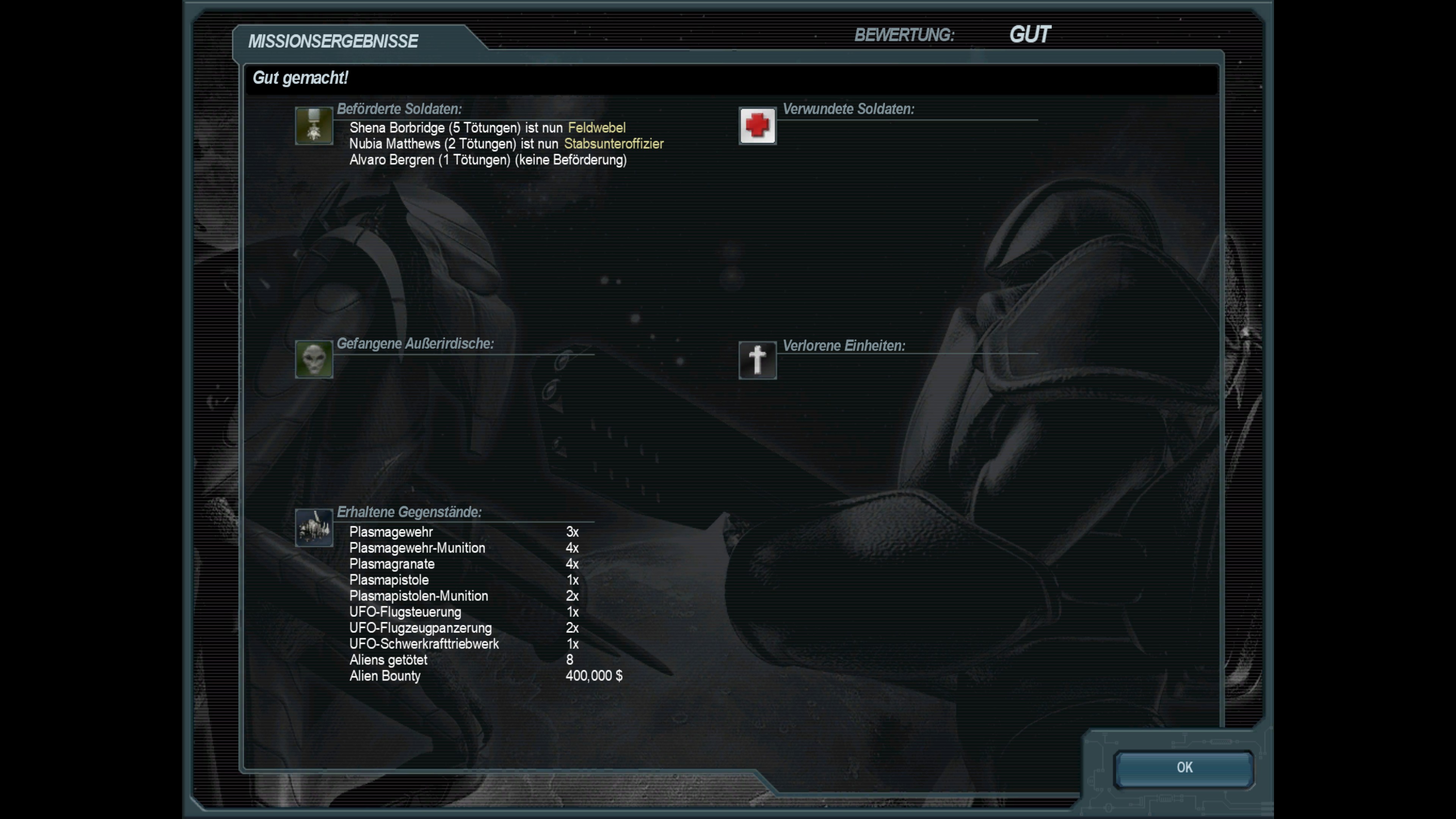 Abschluss der neunzehnten Mission; Berung eines außerirdischen Spähers