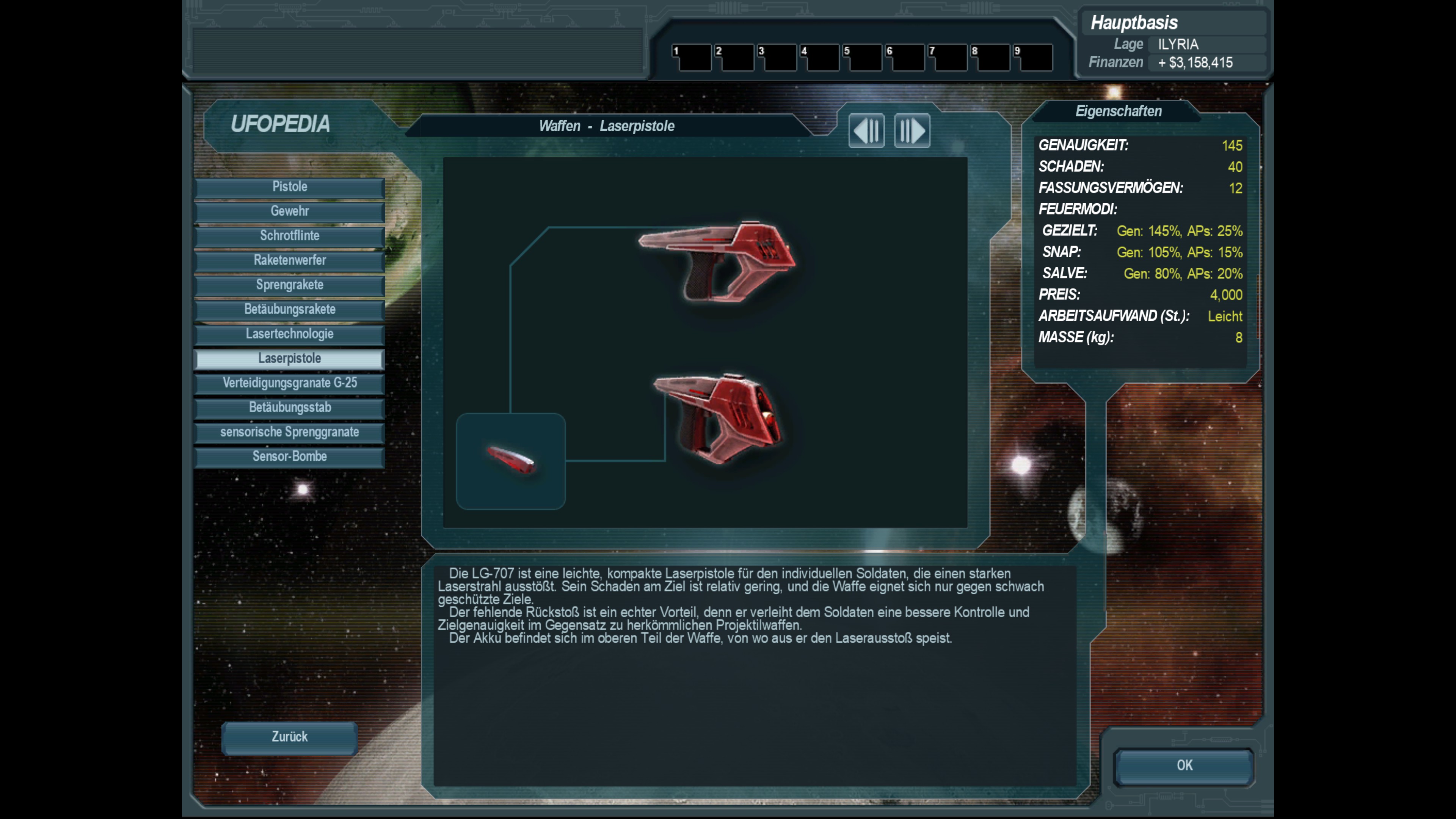 Entwicklung der ersten energiebasierten Pistolen-Waffe für die Infanterie mit einigen Vorteilen gegenüber älteren kalibermuntionsbasierten Pistolen-Waffen zur Modernisierung der Infanterie; diese Pistole wird nur als Zusatzwaffe für z. B. die schweren Soldaten mit Raketenwerfern, Flammenwerfern, Chemowerfern u. Ä. mitgegeben; auch als Zweitwaffe für die Sturmsoldaten (Stichwort: Schrotflinte mit kurzer Reichweite) ist diese nicht zu verachten
