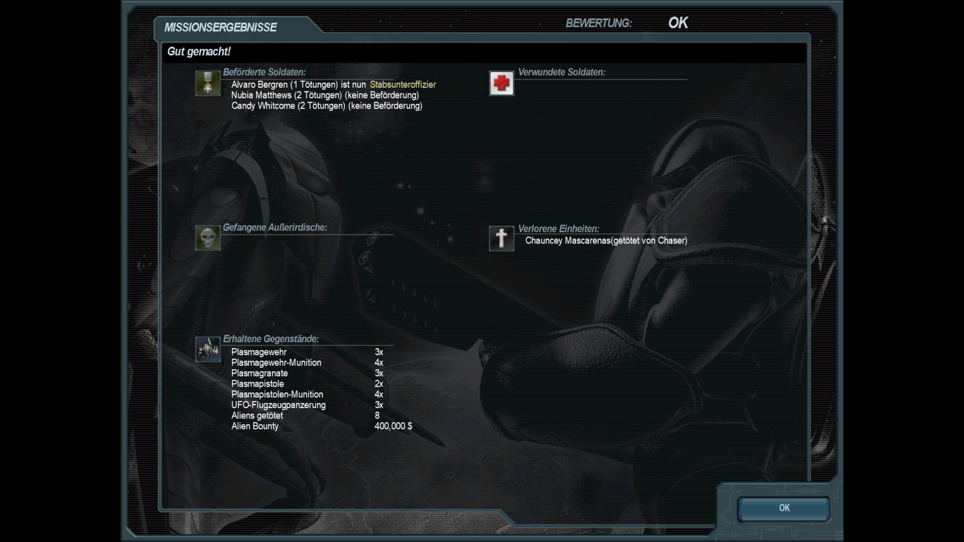 Abschluss der zwanzigsten Mission; Bergung eines außerirdischen Jägers