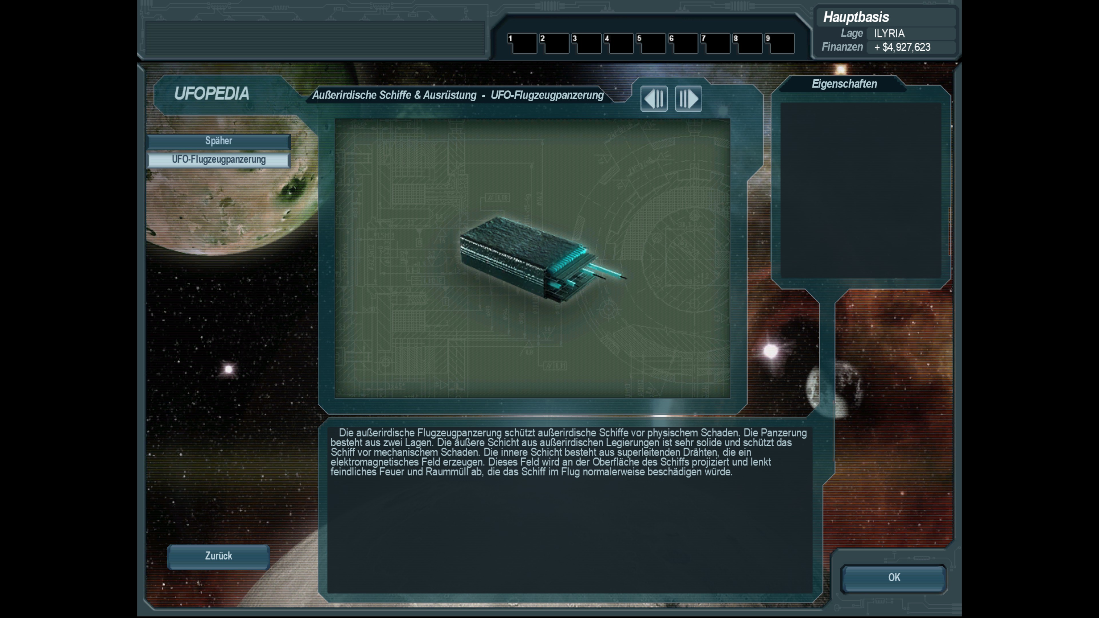 Erforschung der UFO-Flugzeugpanzerung; genauere Untersuchung ergibt, dass diese eine doppelte Funktion hat mit externen äußerst harten Panzerplatten und internen Leitungen, welche Energieleitungen sind für z. B. Deflektoren und aktive Schutzschilde