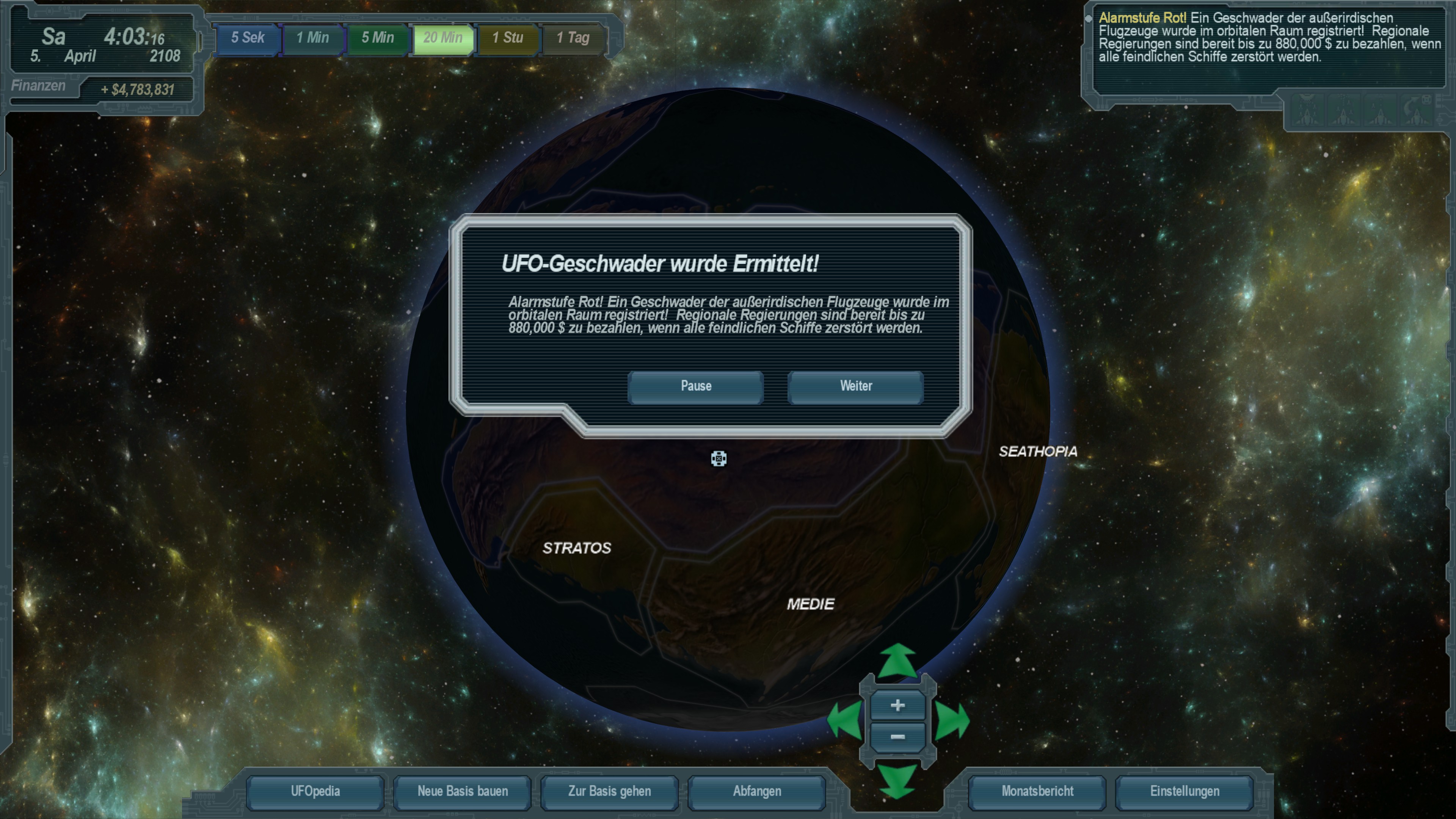 Das erste Worst-Case-Scenario, was dir auf Esperanza passieren kann und alle paar Monate stattfindet; hier kommt ein komplettes Geschwader, das von den anderen UFOs und UFO-Schwärmen unabhängig aggiert (die Geschwader-UFOs sind komplett farblich markiert, um diese von den anderen UFOs unterscheiden zu können); dieses ist äußerst schwer zu finden, vor allem mit den Standard-Erkennungsstationen, wobei man beim Geschwader-Führer auch einzigartige Gegenstände findet; zudem erhält man einen Haufen batzen Credits, wenn man die entsprechenden UFOs findet, abschießt und über Land diese bergen tut (bzw. später mit den Abfangjäger-Bomben vernichtet; nur beim Geschwader-Führer muss man immer die Bodenmission machen, sonst sind die einzigartigen Gegenstände weg)