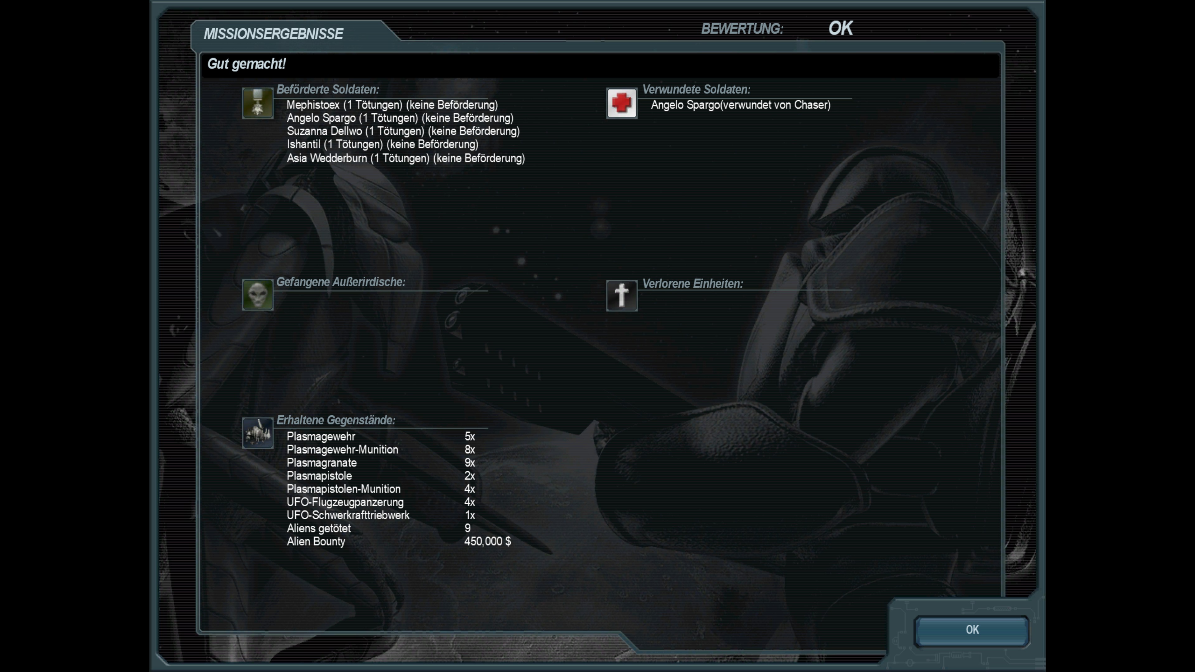 Abschluss der fünfundvierzigsten Mission; Bergung eines außerirdischen Jägers