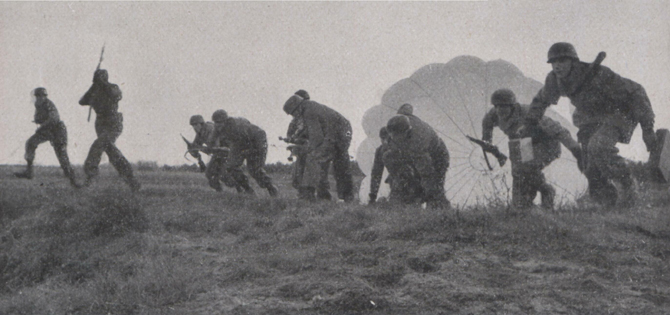 Die Abwurfbehälter mit den Waffen und Minen der Kompanie sind in der Zwischenzeit an Trauben aus Fallschirmen gen Boden gesegelt.