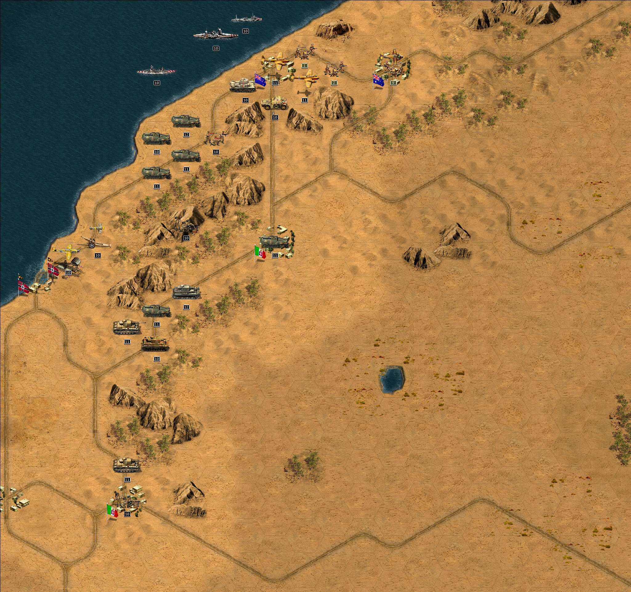 Das Schlachtschiff Giulio Cesare feuert eine Breitseite auf die australische Infanterie, reduziert die Verschanzung auf 2 und vernichtet zwei gegnerische Einheiten.