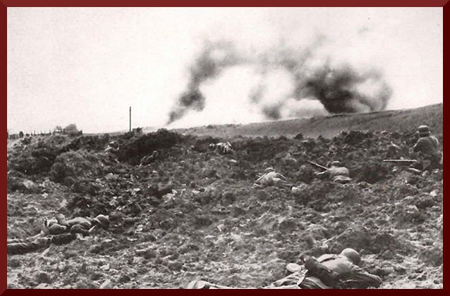Unsere Infanterie hat sich bis dicht an das belgische Fort Boncelles herangearbeitet, gleich wird der Sturmangriff losbrechen.