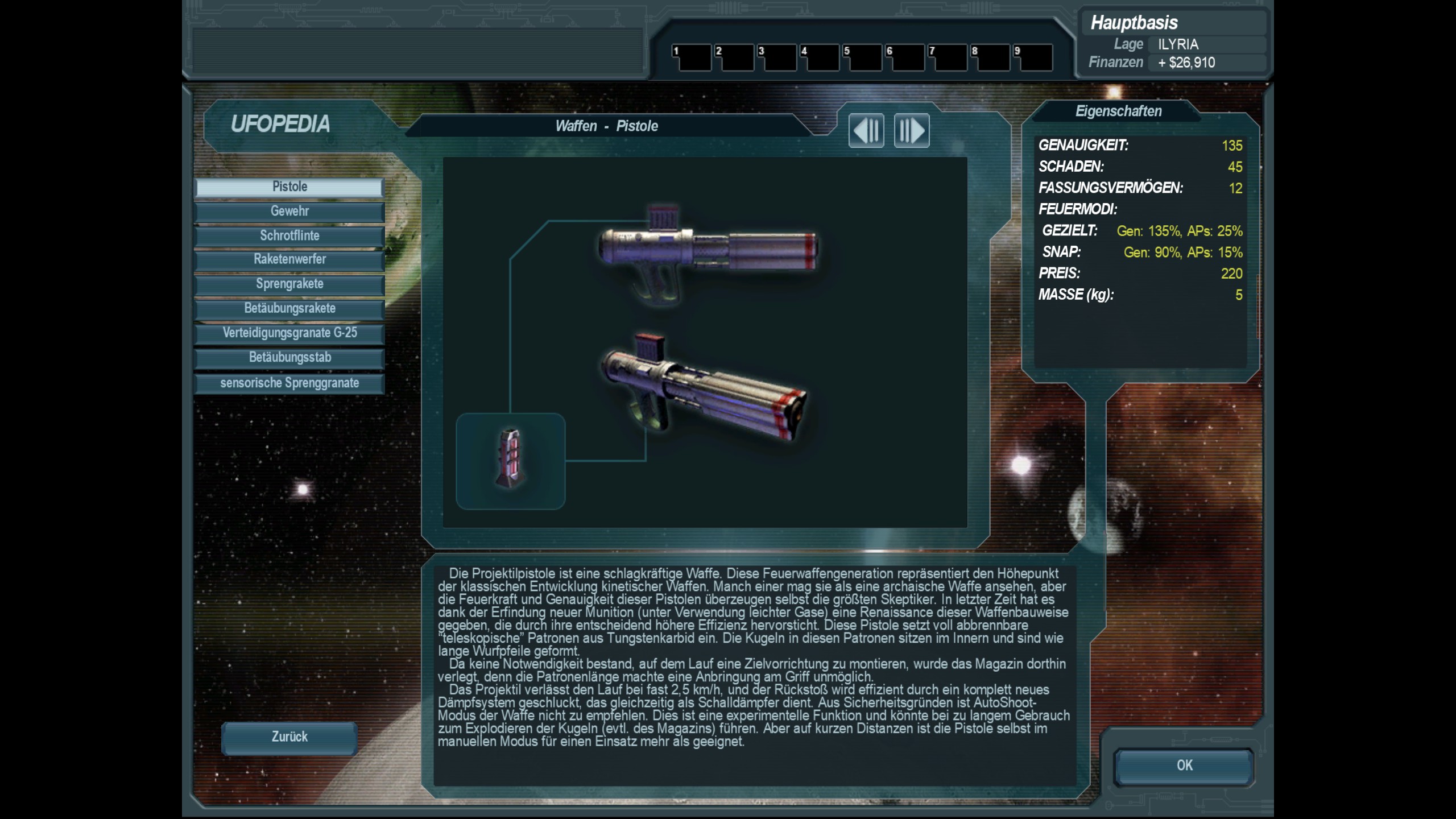 eine normale ältere Feuerwaffe, genannt Pistole, welche mit ihrer Munition auf das 22. Jahrhundert angepasst wurde; Standard-Ausrsütung für die Polizei, schwere Infanterie sowie für hochrangige Militärs, welche nicht im Fronteinsatz sind; auch für Zivilisten erwerbbar